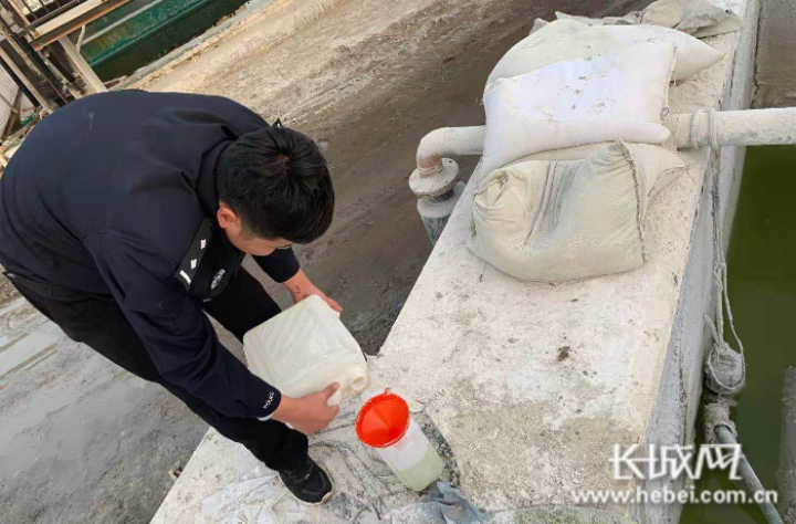 民警现场抽检涉污企业水样。石家庄市公安局供图