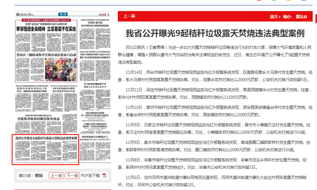 11月1日,石家庄市秸秆垃圾露天焚烧视频监控与红外报警系统发现,赵县韩村镇杨家庄村发生露天焚烧。经查,系杨家庄村村民吴某某露天焚烧路边杂草。对此,韩村镇政府对其处以1000元罚款,公安机关对其进行训诫。