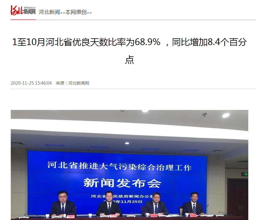 河北新闻网:1至10月河北省优良天数比率为68.9% ,同比增加8.4个百分点