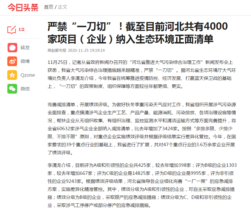 燕赵都市报:严禁“一刀切”!截至目前河北共有4000家项目(企业)纳入生态环境正面清单