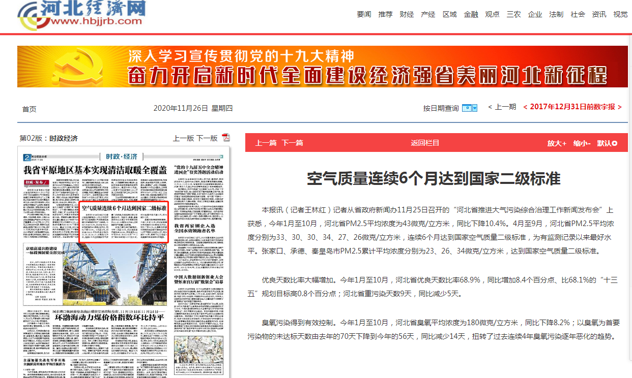 河北经济日报:空气质量连续6个月达到国家二级标准
