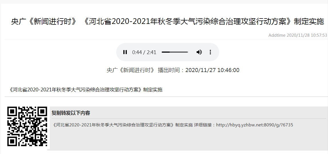 央广《新闻进行时》:《河北省2020-2021年秋冬季大气污染综合治理攻坚行动方案》制定实施