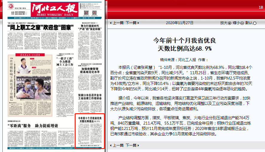 河北工人报:今年前十个月我省优良天数比例高达68.9%