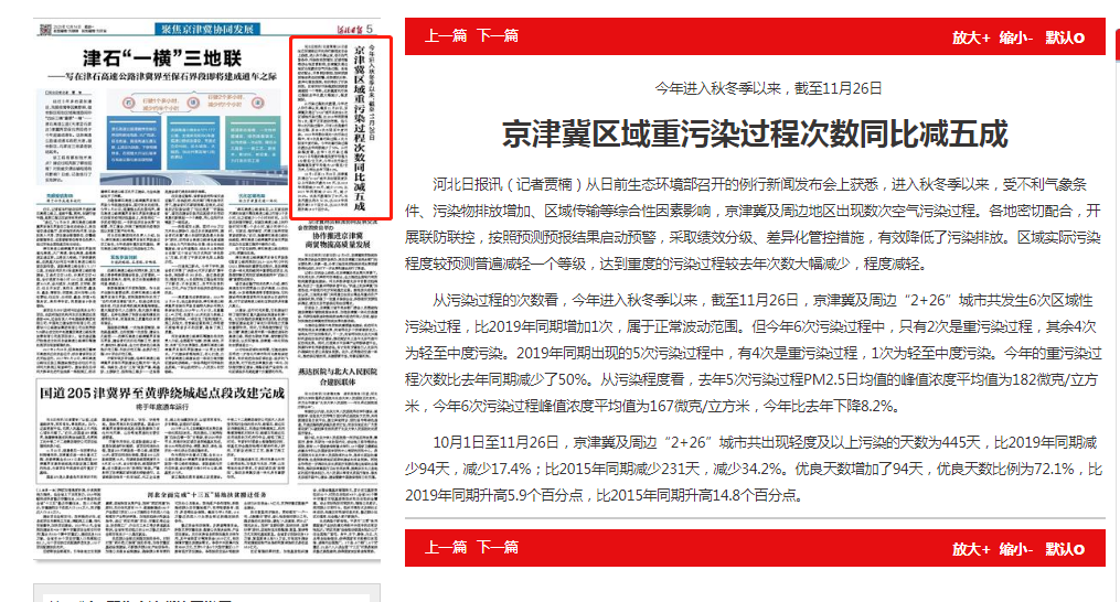 从污染过程的次数看,今年进入秋冬季以来,截至11月26日,京津冀及周边“2+26”城市共发生6次区域性污染过程,比2019年同期增加1次,属于正常波动范围。但今年6次污染过程中,只有2次是重污染过程,其余4次为轻至中度污染。2019年同期出现的5次污染过程中,有4次是重污染过程,1次为轻至中度污染。今年的重污染过程次数比去年同期减少了50%。从污染程度看,去年5次污染过程PM2.5日均值的峰值浓度平均值为182微克/立方米,今年6次污染过程峰值浓度平均值为167微克/立方米,今年比去年下降8.2%。