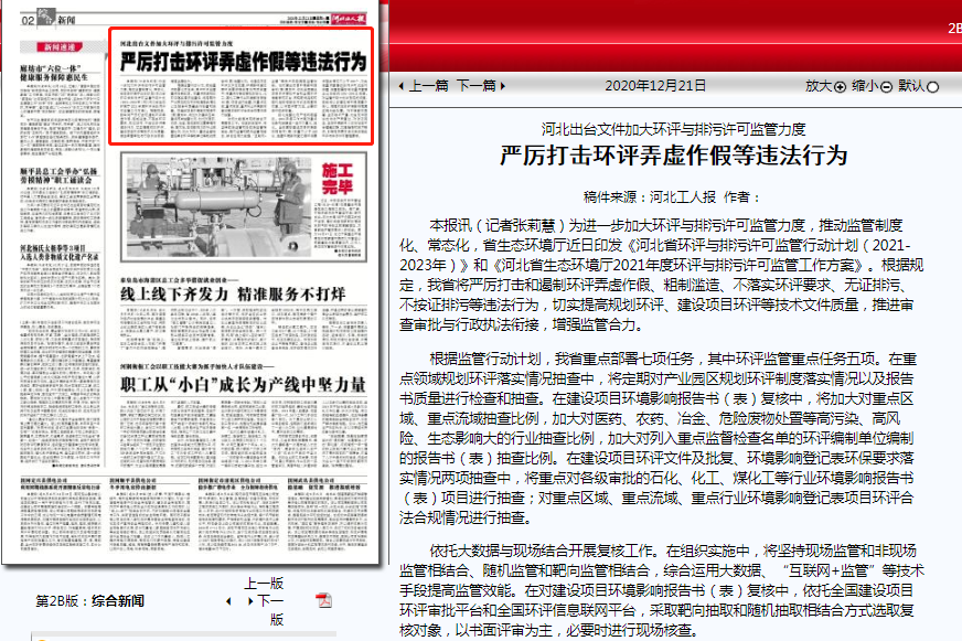 河北工人报:河北出台文件加大环评与排污许可监管力度 严厉打击环评弄虚作假等违法行为