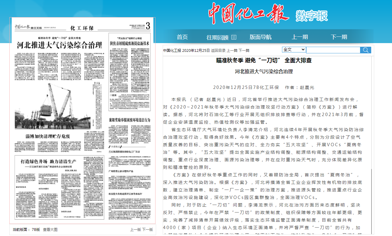 中国化工报:瞄准秋冬季 避免“一刀切” 全面大排查 河北推进大气污染综合治理