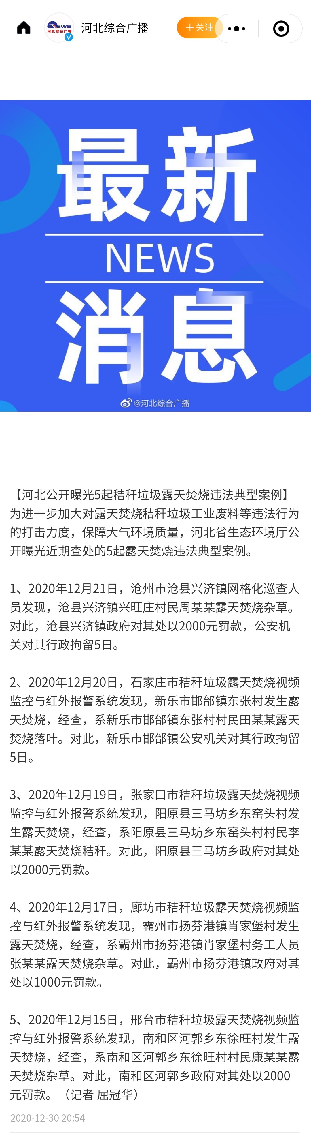 河北综合广播微博:河北公开曝光5起秸秆垃圾露天焚烧违法典型案例
