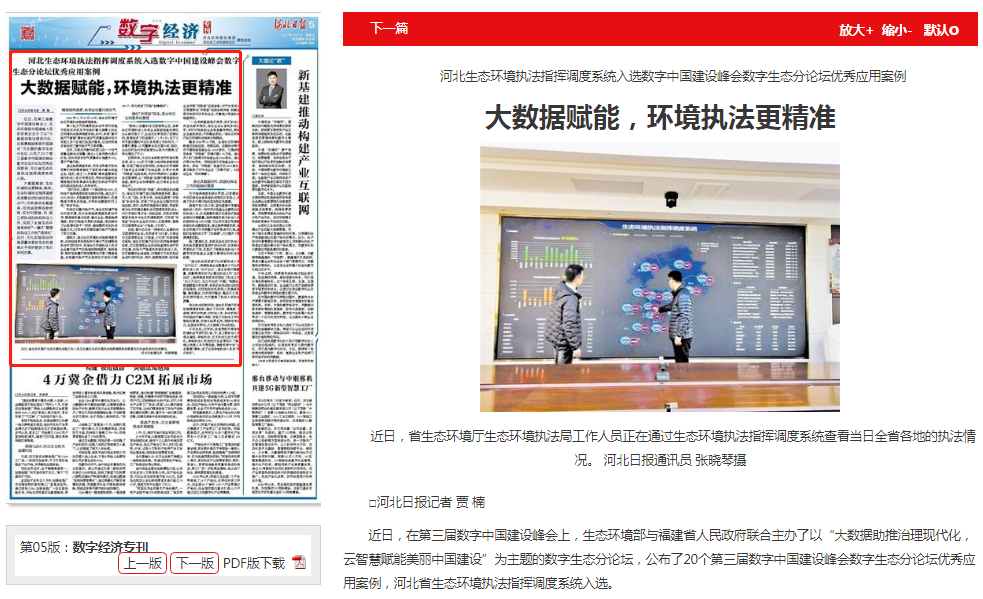 近日,在第三届数字中国建设峰会上,生态环境部与福建省人民政府联合主办了以“大数据助推治理现代化,云智慧赋能美丽中国建设”为主题的数字生态分论坛,公布了20个第三届数字中国建设峰会数字生态分论坛优秀应用案例,河北省生态环境执法指挥调度系统入选。