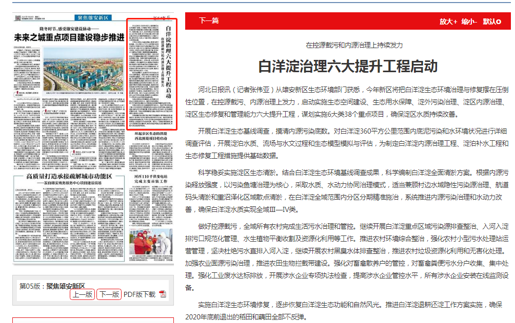 河北日报:在控源截污和内源治理上持续发力 白洋淀治理六大提升工程启动