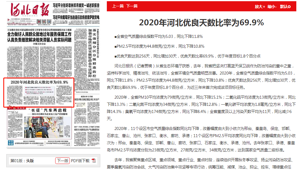 2020年,11个设区市空气质量综合指数同比均下降,改善幅度由大到小依次为邢台、秦皇岛、保定、邯郸、石家庄、唐山、沧州、张家口、衡水、廊坊、承德;11个设区市PM2.5平均浓度同比均下降,改善幅度由大到小依次为:邢台、秦皇岛、保定、邯郸、唐山、廊坊、张家口、石家庄、衡水、承德、沧州。去年张家口、承德、秦皇岛市PM2.5平均浓度分别为23微克/立方米、27微克/立方米、34微克/立方米,达到国家空气质量二级标准。