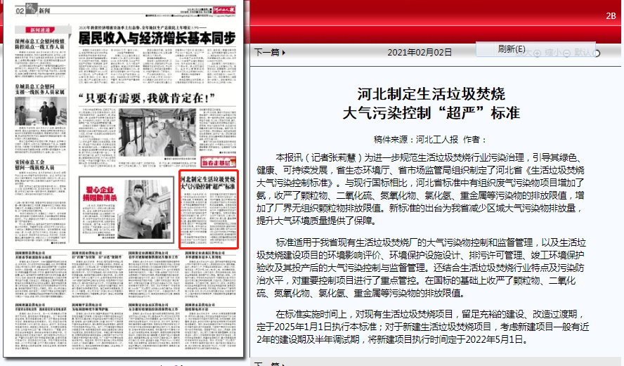 河北工人报:河北制定生活垃圾焚烧大气污染控制“超严”标准 来源:河北省生态环境宣传教育中心 时间:2021-02-09