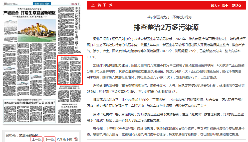 河北日报讯(通讯员刘力嘉)从雄安新区生态环境局获悉,2020年,雄安新区持续开展铁腕执法,始终保持严厉打击生态环境违法行为的高压态势。截至去年年底,新区生态环境部门通过深入开展污染源排查整治,排查出涉气、涉水、涉土、固体废物与危险废物等各类污染源21073个,发现问题889个,已全部整改完成,整改完成率100%。