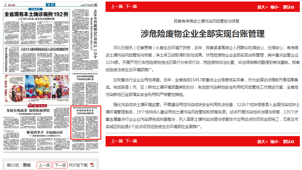 强化污染地块土壤环境监管。开展建设用地污染地块安全利用执法检查,1226个地块信息录入全国污染地块土壤环境管理系统,19个地块纳入建设用地土壤污染风险管控和修复名录。试点开展污染地块治理与修复,135个涉重金属重点行业企业污染源完成排查整治,列入国家土壤污染治理与修复技术应用试点的项目全部完工,石家庄市栾城区和赵县2个试点项目经验被生态环境部在全国推广。