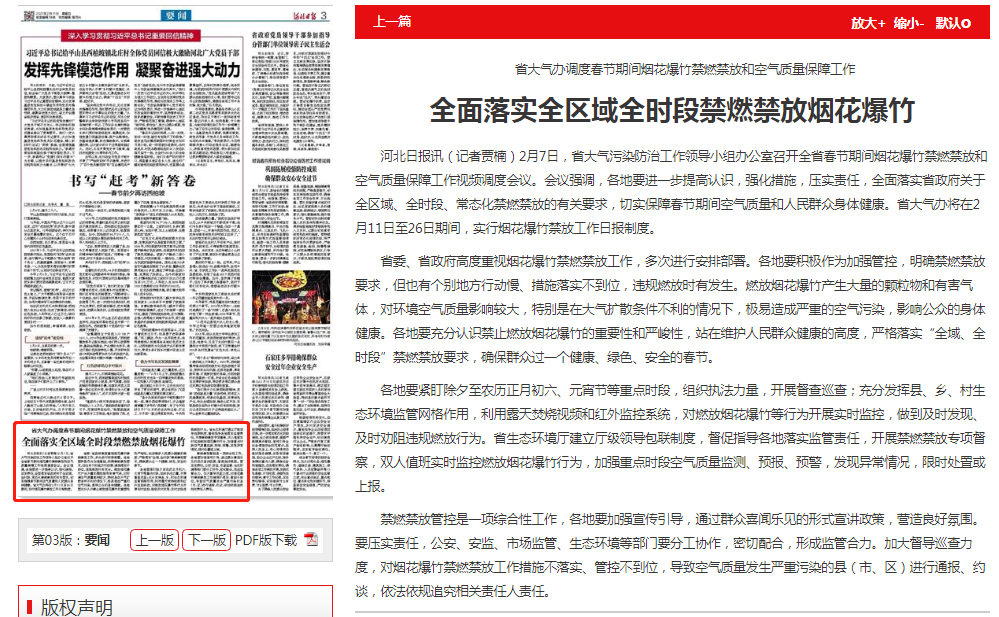 省委、省政府高度重视烟花爆竹禁燃禁放工作,多次进行安排部署。各地要积极作为加强管控,明确禁燃禁放要求,但也有个别地方行动慢、措施落实不到位,违规燃放时有发生。燃放烟花爆竹产生大量的颗粒物和有害气体,对环境空气质量影响较大,特别是在大气扩散条件不利的情况下,极易造成严重的空气污染,影响公众的身体健康。各地要充分认识禁止燃放烟花爆竹的重要性和严峻性,站在维护人民群众健康的高度,严格落实“全域、全时段”禁燃禁放要求,确保群众过一个健康、绿色、安全的春节。