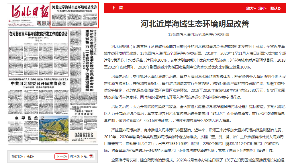 河北日报讯(记者贾楠)从省政府新闻办日前召开的河北省渤海综合治理成效新闻发布会上获悉,全省近岸海域生态环境明显改善。13条国考入海河流全部消除劣V类断面。2019年、2020年1至11月入海口断面水质均值全部达到V类及以上水质标准,达标率100%,其中达到Ⅲ类以上优良水质河流6条;近岸海域水质达到预期目标,2018至2019年连续两年、2020年到目前近岸海域国考监测点位海水水质优良比例稳定达到100%。