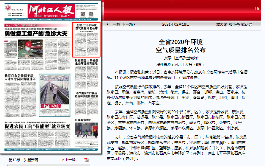 公布2020年全省环境空气质量排名情况。11个设区市空气质量最好的是张家口,石家庄最差。
