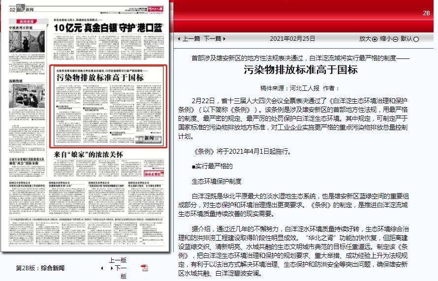 2月22日,省十三届人大四次会议全票表决通过了《白洋淀生态环境治理和保护条例》(以下简称《条例》)。该条例是涉及雄安新区的首部地方性法规,用最严格的制度、最严密的规定、最严厉的处罚保护白洋淀生态环境。其中规定,可制定严于国家标准的污染物排放地方标准,对工业企业实施更严格的重点污染物排放总量控制计划。
