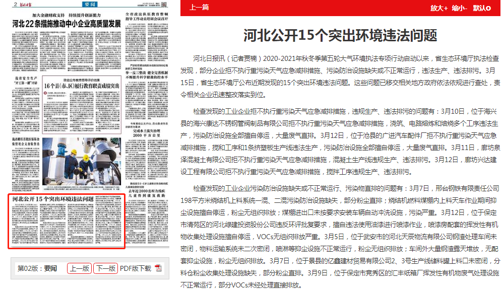 检查发现的工业企业拒不执行重污染天气应急减排措施,违规生产、违法排污的问题有:3月10日,位于海兴县的海兴康达不锈钢管阀制品有限公司拒不执行重污染天气应急减排措施,浇筑、电路熔炼和焙烧多个工序违法生产,污染防治设施全部擅自停运,大量废气直排。3月12日,位于沧县的广进汽车配件厂拒不执行重污染天气应急减排措施,搅和工序和1条挤塑板生产线违法生产,污染防治设施全部擅自停运,大量废气直排。3月11日,廊坊泉泽混凝土有限公司拒不执行重污染天气应急减排措施,混凝土生产线违规生产、违法排污。3月12日,廊坊兴达建设工程有限公司拒不执行重污染天气应急减排措施,搅拌工序违规生产、违法排污。