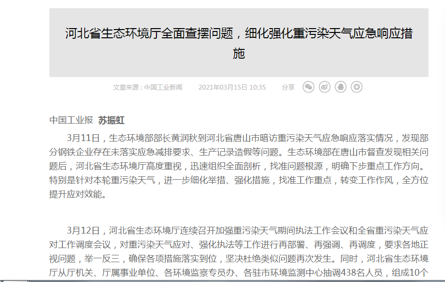 3月11日,生态环境部部长黄润秋到河北省唐山市暗访重污染天气应急响应落实情况,发现部分钢铁企业存在未落实应急减排要求、生产记录造假等问题。生态环境部在唐山市督查发现相关问题后,东京热
