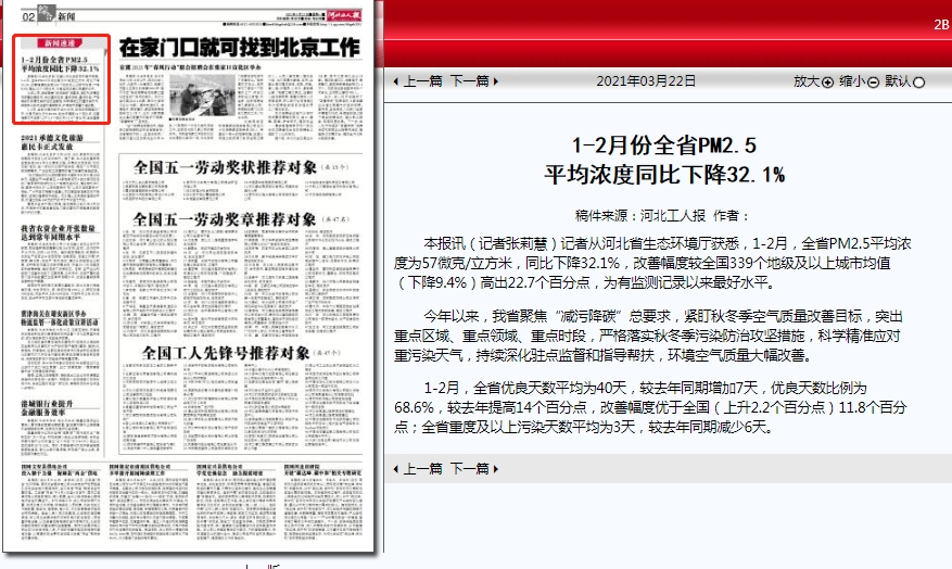 河北工人报:1-2月份全省PM2.5平均浓度同比下降32.1%