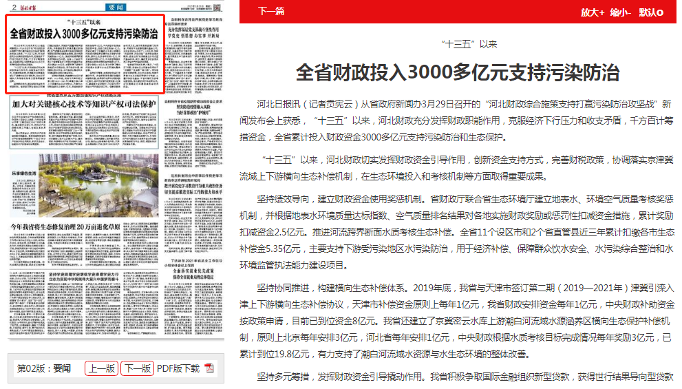 河北日报:“十三五”以来 全省财政投入3000多亿元支持污染防治