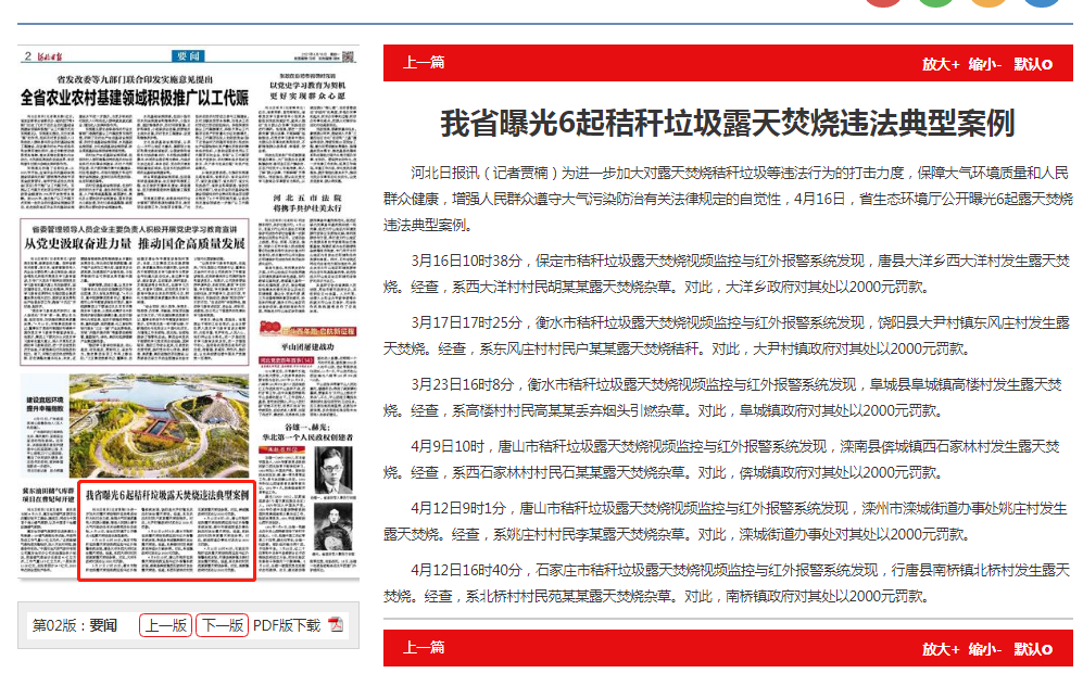 3月23日16时8分,衡水市秸秆垃圾露天焚烧视频监控与红外报警系统发现,阜城县阜城镇高楼村发生露天焚烧。经查,系高楼村村民高某某丢弃烟头引燃杂草。对此,阜城镇政府对其处以2000元罚款。