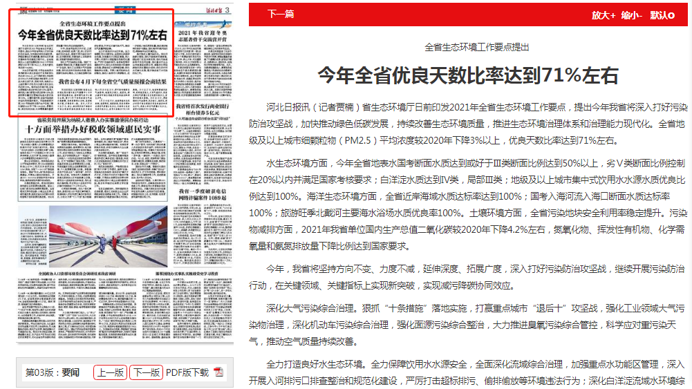 水生态环境方面,今年全省地表水国考断面水质达到或好于Ⅲ类断面比例达到50%以上,劣Ⅴ类断面比例控制在20%以内并满足国家考核要求;白洋淀水质达到Ⅳ类,局部Ⅲ类;地级及以上城市集中式饮用水水源水质优良比例达到100%。海洋生态环境方面,全省近岸海域水质达标率达到100%;国考入海河流入海口断面水质达标率100%;旅游旺季北戴河主要海水浴场水质优良率100%。土壤环境方面,全省污染地块安全利用率稳定提升。污染物减排方面,2021年我省单位国内生产总值二氧化碳较2020年下降4.2%左右,氮氧化物、挥发性有机物、化学需氧量和氨氮排放量下降比例达到国家要求。