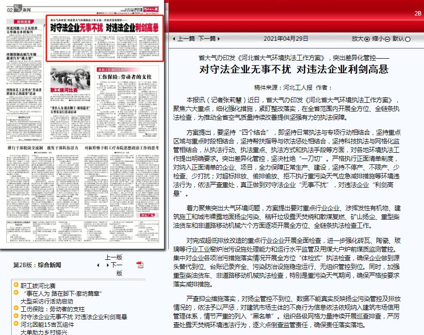 河北工人报:对守法企业无事不扰 对违法企业利剑高悬