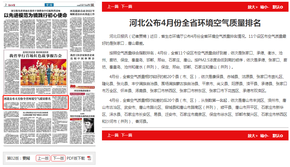 按照空气质量综合指数排名,4月份,全省11个设区市空气质量由好到差,依次是张家口、承德、衡水、沧州、廊坊、保定、秦皇岛、邯郸、邢台、石家庄、唐山。按PM2.5浓度由低到高的顺序,依次是承德、张家口、廊坊、秦皇岛、沧州和衡水(并列)、保定、邢台、邯郸、石家庄和唐山(并列)。