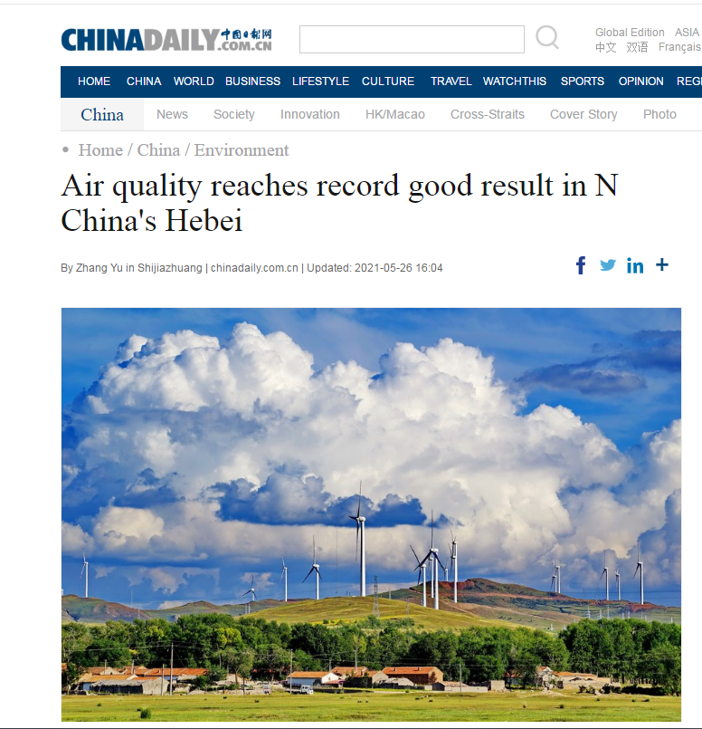 中国日报网:Air quality reaches record good result in N China's Hebei