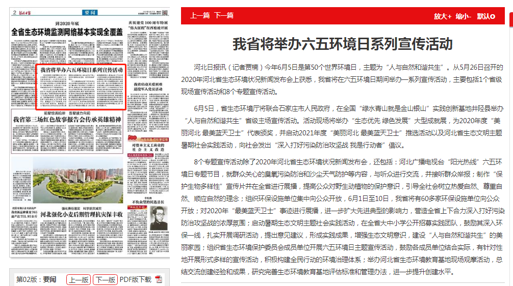 8个专题宣传活动除了2020年河北省生态环境状况新闻发布会,还包括:河北广播电视台“阳光热线”六五环境日专题节目,就群众关心的臭氧污染防治和沙尘天气防护等内容,与听众进行交流,并接听群众举报;制作“保护生物多样性”宣传片并在全省进行展播,提高公众对野生动植物的保护意识,引导全社会树立热爱自然、尊重自然、顺应自然的理念;组织环保设施单位集中向公众开放,6月1日至10日,我省将有60多家环保设施单位向公众开放;对2020年“最美蓝天卫士”事迹进行展播,进一步扩大先进典型的影响力,营造全省上下合力深入打好污染防治攻坚战的浓厚氛围;启动暑期生态文明主题社会实践活动,在全省大中小学公开招募实践团队,鼓励其深入环保一线,扎实开展调研活动,提出意见建议,形成实践成果,增强生态文明意识,建设“人与自然和谐共生”的美丽家园;组织省生态环境保护委员会成员单位开展六五环境日主题宣传活动,鼓励各成员单位结合实际,有针对性地开展形式多样的宣传活动,积极构建全民行动的环境治理体系;举办河北省生态环境教育基地现场观摩活动,总结交流创建经验和成果,研究完善生态环境教育基地评估标准和管理办法,进一步提升创建水平。
