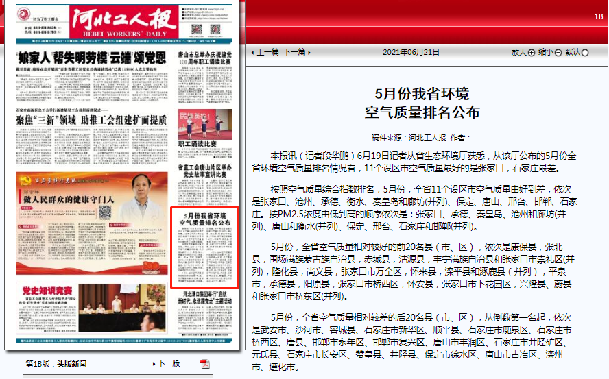 获悉,从该厅公布的5月份全省环境空气质量排名情况看,11个设区市空气质量最好的是张家口,石家庄最差。