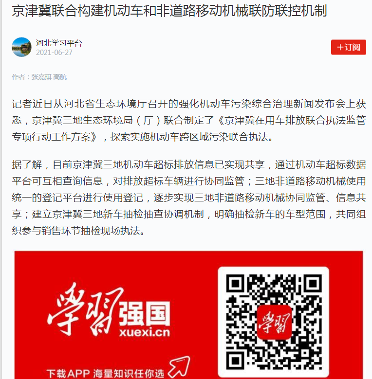 学习强国河北平台:京津冀联合构建机动车和非道路移动机械联防联控机制