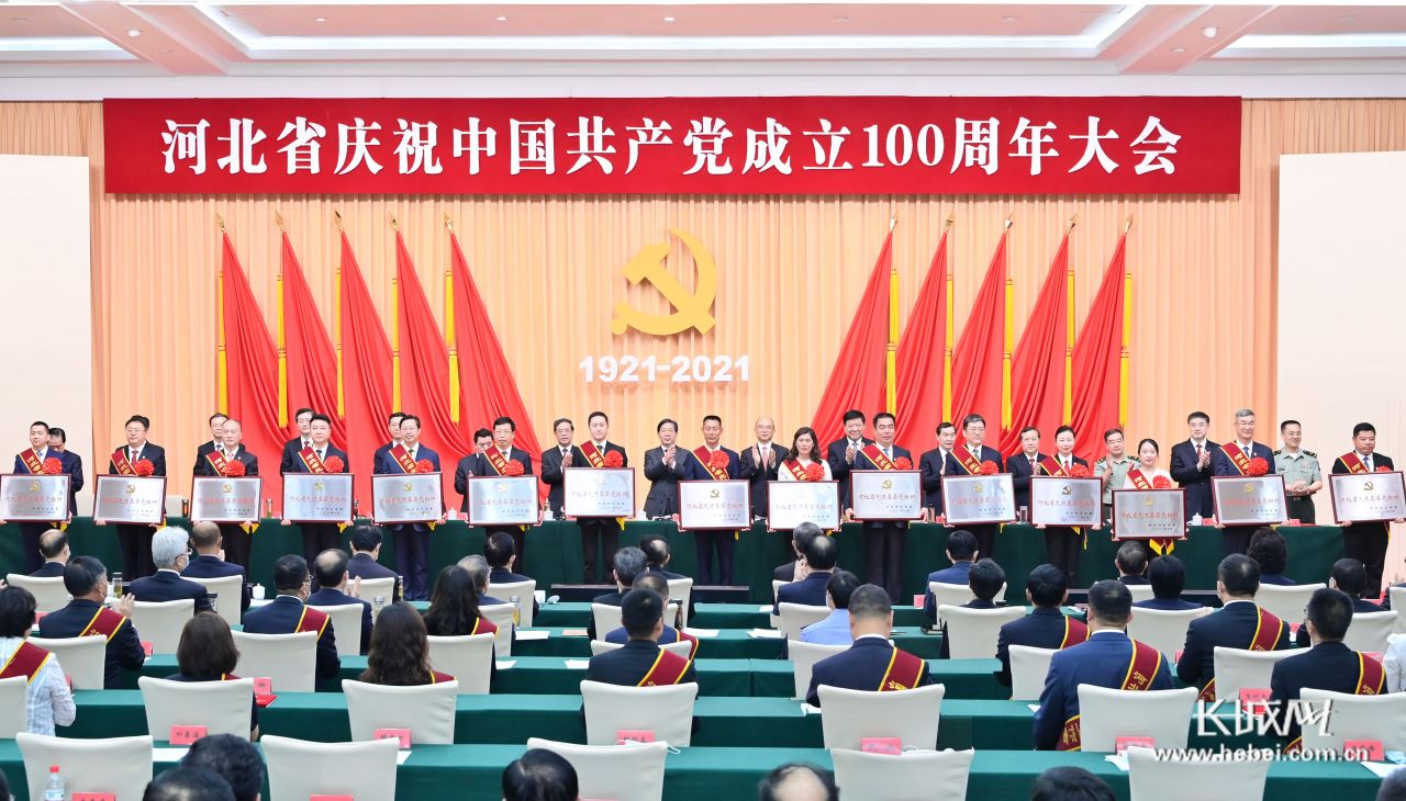 7月1日下午,河北省庆祝中国共产党成立100周年大会在革命圣地西柏坡召开。这是王东峰为受表彰的先进个人和先进集体代表颁奖。长城网记者 耿佳 摄