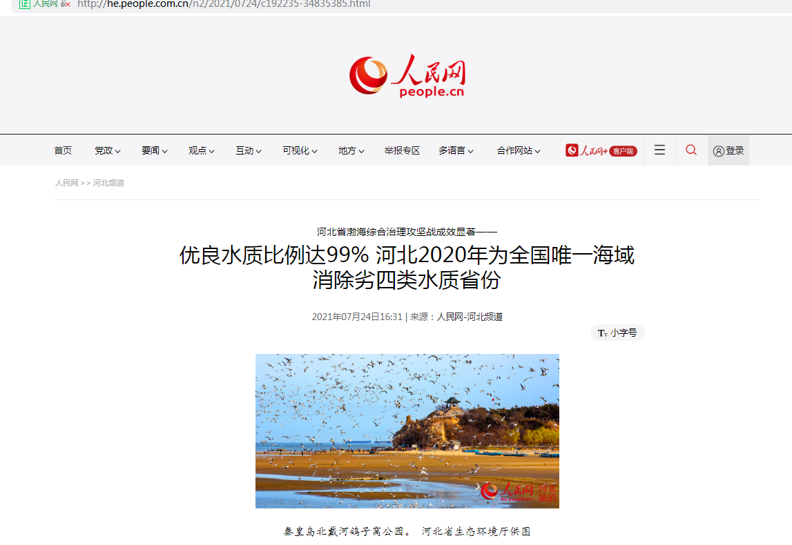 人民网:优良水质比例达99% 河北2020年为全国唯一海域消除劣四类水质省份