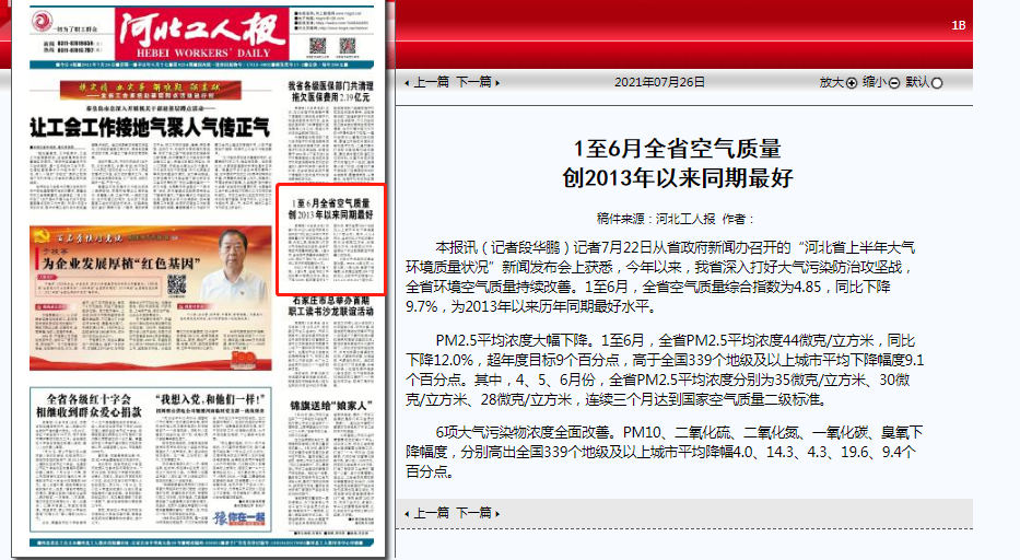 河北工人报:1至6月全省空气质量创2013年以来同期最好