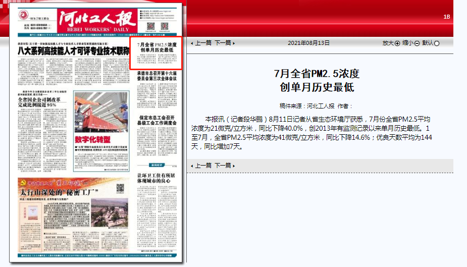 河北工人报: 7月全省PM2.5浓度创单月历史最低 来源:河北省生态环境宣传教育中心 时间:2021-08-13