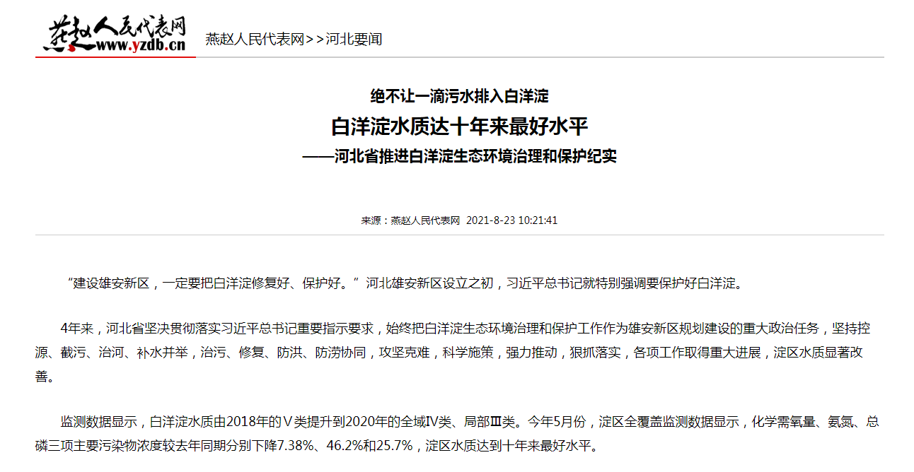 一系列治污措施的落实,推动白洋淀上游流域生态环境质量实现了明显改善。