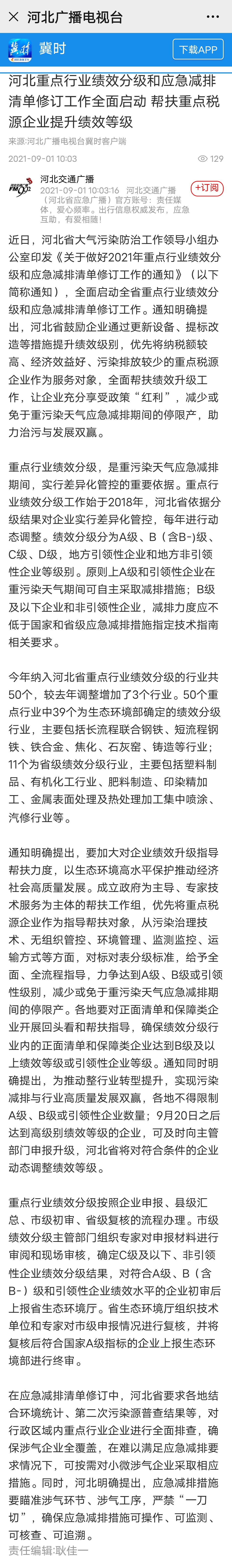 河北广播电视台冀时客户端:河北重点行业绩效分级和应急减排清单修订工作全面启动 帮扶重点税源企业提升绩效等级 来源:河北省生态环境宣传教育中心 时间:2021-09-02