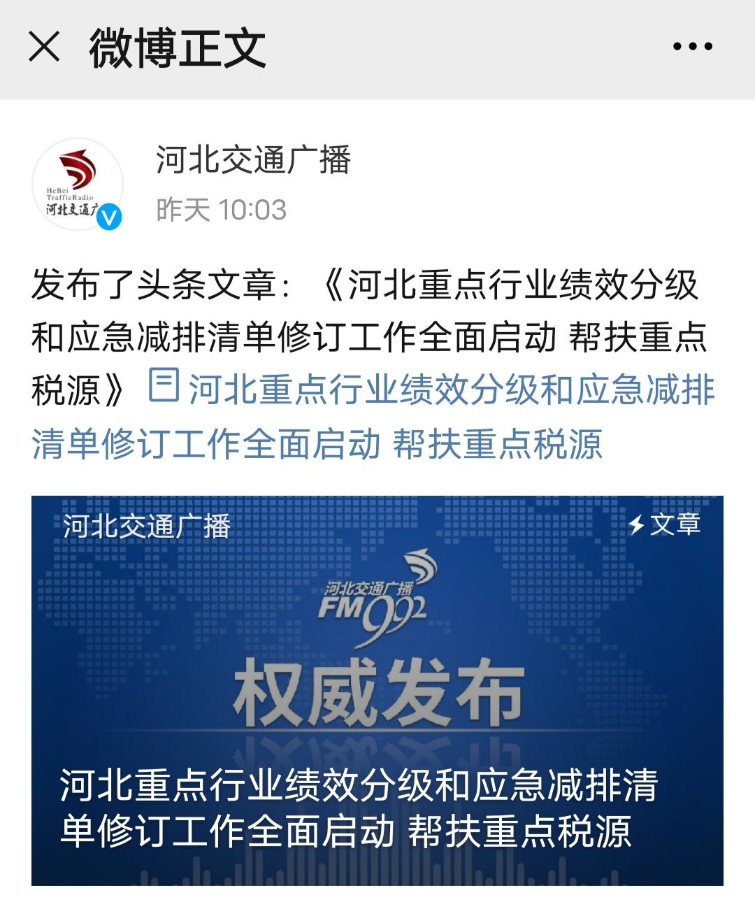 河北交通广播微博:河北重点行业绩效分级和应急减排清单修订工作全面启动 帮扶重点税源