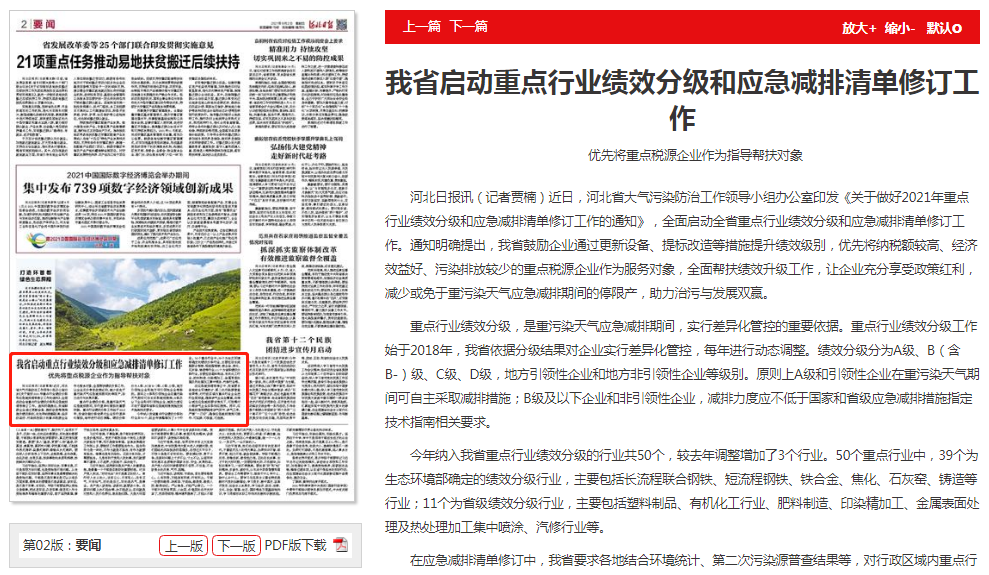 河北日报:我省启动重点行业绩效分级和应急减排清单修订工作