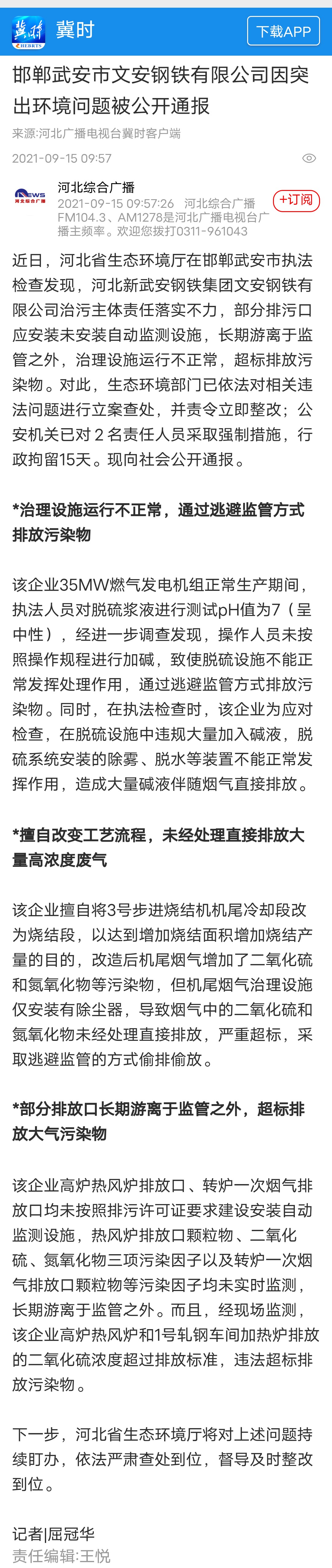 河北广播电视台冀时客户端:邯郸武安市文安钢铁有限公司因突出环境问题被公开通报