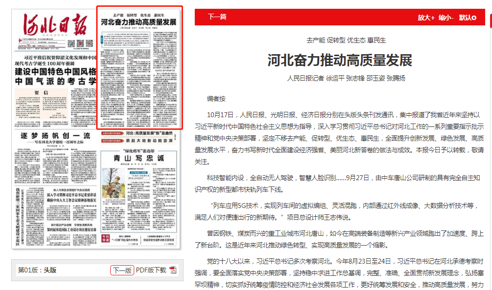10月17日,人民日报、光明日报、经济日报分别在头版头条刊发通讯,集中报道了我省近年来坚持以习近平新时代中国特色社会主义思想为指导,深入学习贯彻习近平总书记对河北工作的一系列重要指示批示精神和党中央决策部署,坚定不移去产能、促转型、优生态、惠民生,全面提升创新发展、绿色发展、高质量发展水平,奋力书写新时代全面建设经济强省、美丽河北新答卷的做法与成效。本报今日予以转载,敬请关注。