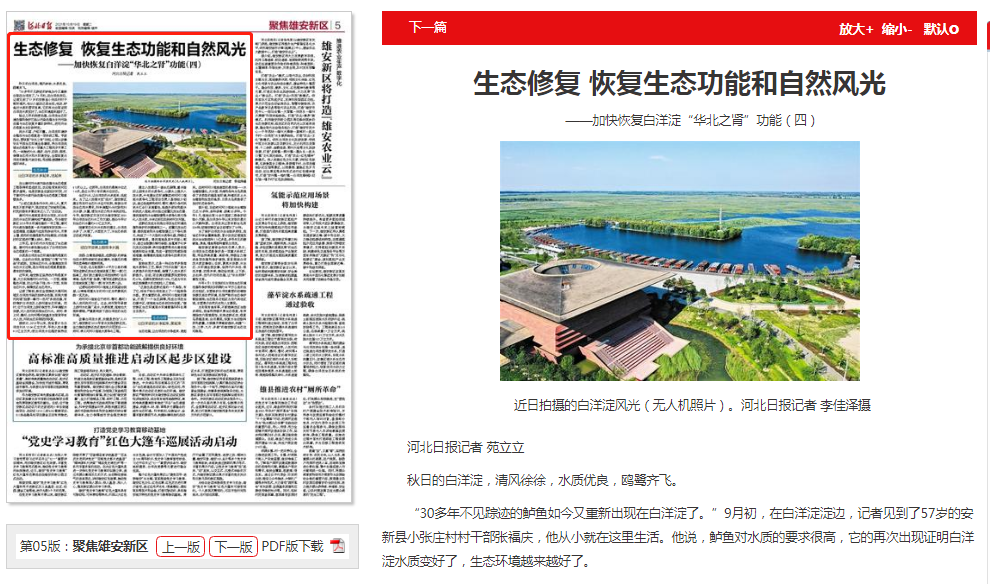 近年来,雄安新区坚持治污和修复并重,大力实施清河补水行动。一方面,清理整治河道,防止污染下泄;另一方面,实施生态补水,保障淀区生态用水。