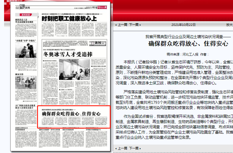 河北工人报 :我省开展典型行业企业及周边土壤污染状况调查——确保群众吃得放心、住得安心
