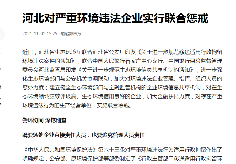燕赵都市报:河北对严重环境违法企业实行联合惩戒