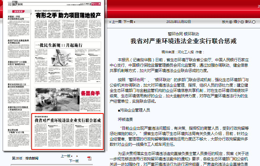 河北工人报:我省对严重环境违法企业实行联合惩戒