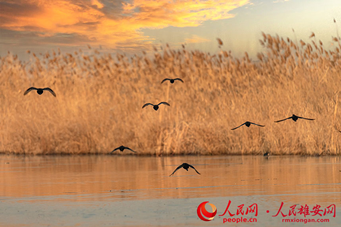 图为鸟儿在白洋淀里飞翔。石景华摄