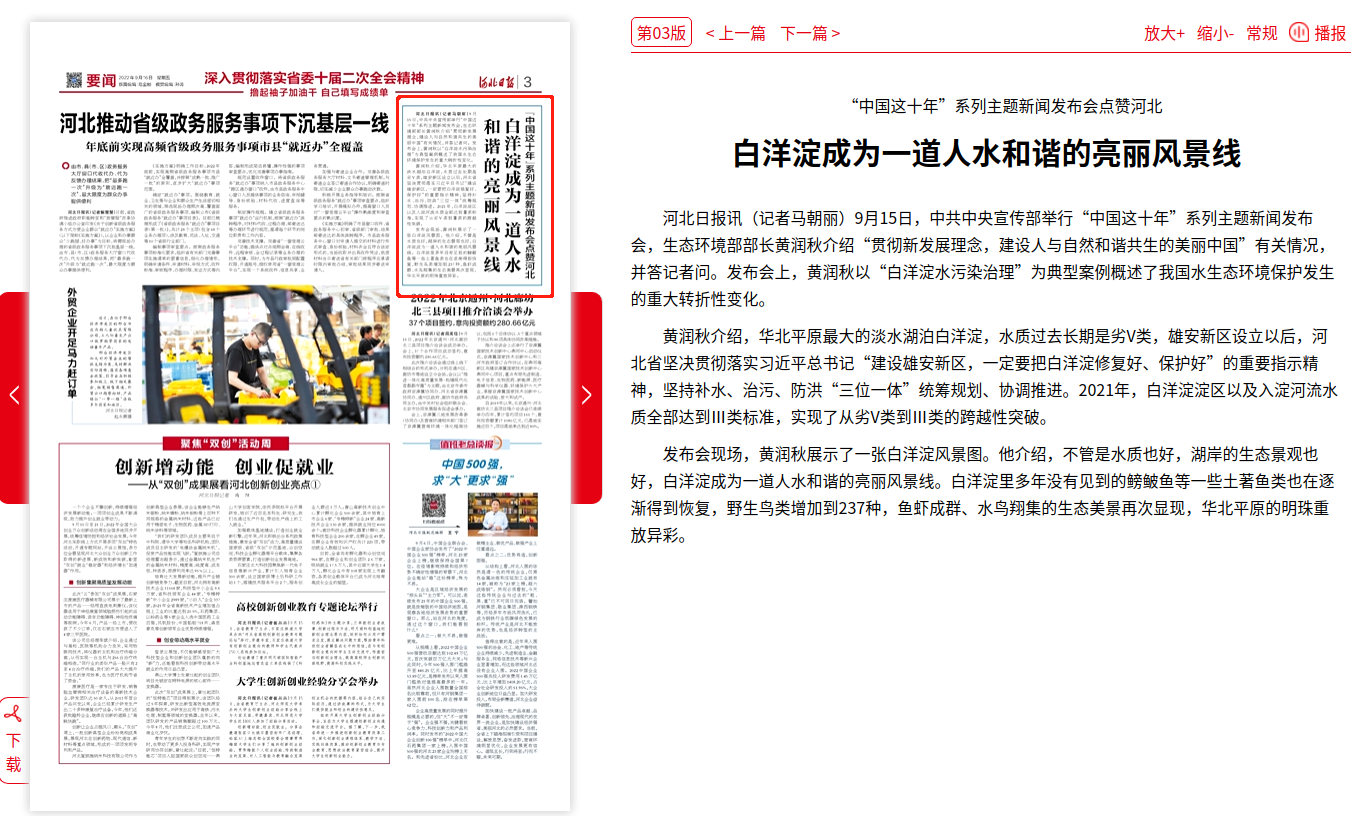 河北日报讯(记者马朝丽)9月15日,中共中央宣传部举行“中国这十年”系列主题新闻发布会,生态环境部部长黄润秋介绍“贯彻新发展理念,建设人与自然和谐共生的美丽中国”有关情况,并答记者问。发布会上,黄润秋以“白洋淀水污染治理”为典型案例概述了我国水生态环境保护发生的重大转折性变化。