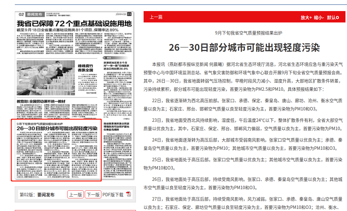 本报讯(燕赵都市报纵览新闻 何晨曦)据东京热 消息,河北省生态环境应急与重污染天气预警中心与中国环境监测总站、省气象灾害防御和环境气象中心联合开展9月下旬全省空气质量预报会商。其中,26日—30日,我省地面转弱气压场控制,早晚时段风力减小、湿度升高,大部地区扩散条件转差,污染持续累积,部分城市可能出现轻度污染,首要污染物为PM2.5和PM10。具体预报结果如下: